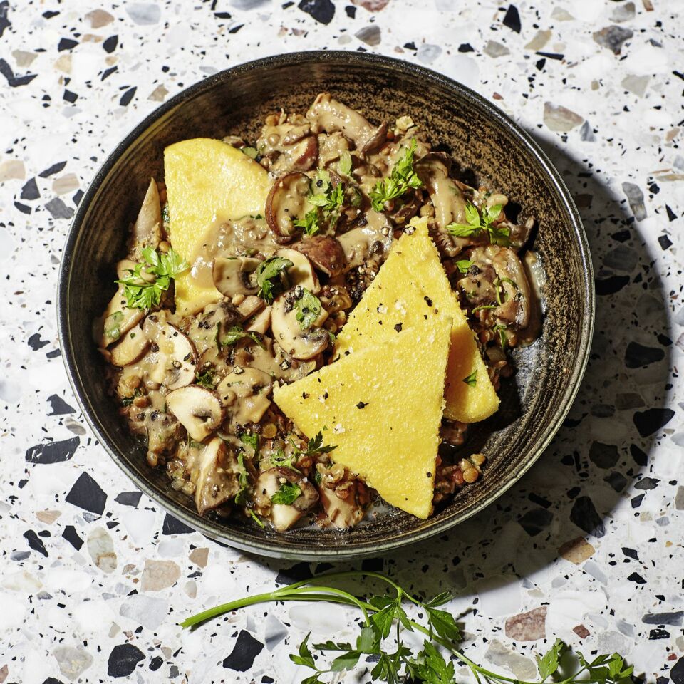 Die Polenta in kleine Dreiecke schneiden. Linsen-Pilz-Rahm zusammen mit den Polentaecken auf Tellern anrichten, mit restlicher Petersilie bestreuen und servieren.