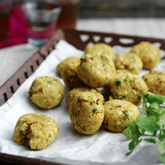 Zwiebeln und Knoblauch schälen und fein würfeln. Das Öl in einer kleinen Pfanne erhitzen, darin die Zwiebeln goldbraun braten. Knoblauch dazugeben und kurz mitbraten. Ingwer schälen und fein hacken. Koriander abbrausen und trocken schütteln, die Blättchen abzupfen und fein hacken. Alles mit dem Backpulver unter die Linsen rühren und den Teig kräftig salzen.