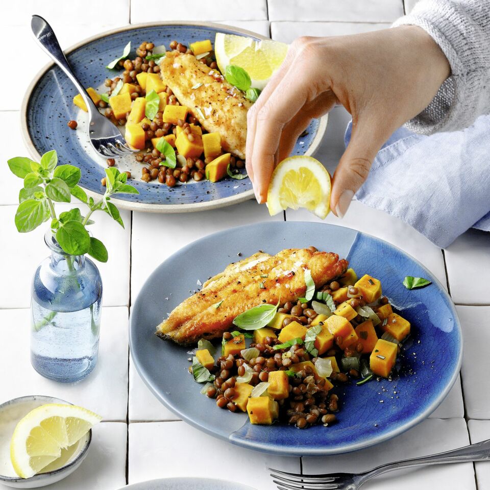 Die Linsen abtropfen lassen, nach Belieben abbrausen und mit in den Süßkartoffel-Topf geben. Alles noch ca. 2 Min. köcheln lassen, dann nochmals mit Salz, Pfeffer und nach Belieben mit 1-2 EL Aceto balsamico abschmecken. Mit Basilikum bestreuen und mit den knusprig gegarten Fischstücken servieren.