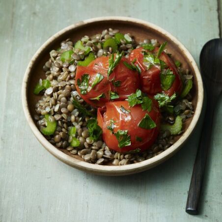 Die Petersilie waschen, trocken schütteln, die Blätter abzupfen, grob hacken und unter die Tomaten mischen. Mit dem Linsengemüse anrichten und servieren.