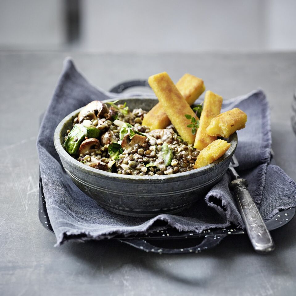 Zwischendurch die Polenta aus der Form stürzen und in Streifen schneiden (ca. 2 × 8 cm). In einer großen beschichteten Pfanne das Bratöl erhitzen. Die Polentastreifen hineingeben und bei mittlerer Hitze so lange auf jeder Seite braten, bis sie goldbraun und knusprig sind. Mit dem Linsenragout servieren.