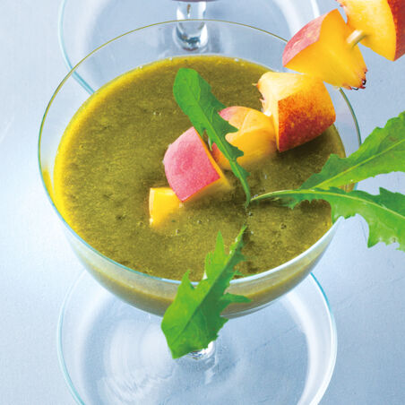 Den Pfirsich, waschen, entsteinen, in mundgerechte Stücke schneiden und auf Holzspieße stecken. Smoothie in die bereitgestellten Gläser füllen und in jedes Glas je einen Spieß und einige zarte Blättchen Löwenzahn stellen. Gut gelaunt genießen.