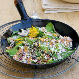 Selbst gesammelt schmeckt er am besten! Der etwas bittere Löwenzahn wird durch Speck, Reis und Käse gezähmt. Und die Blüten sind ein echter Hingucker.