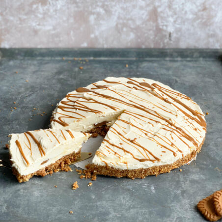 Für den Boden Biscoff Kekse und Butterkekse in einen Gefrierbeutel legen und mit einem Nudelholz zerstoßen. Butter in einem Topf erhitzen und zusammen mit den Keksbröseln in einer Schüssel vermengen. Masse in die Kuchenform füllen, mit einem Esslöffel glatt streichen und andrücken. Kuchenform mindestens 30 Minuten in den Kühlschrank stellen.