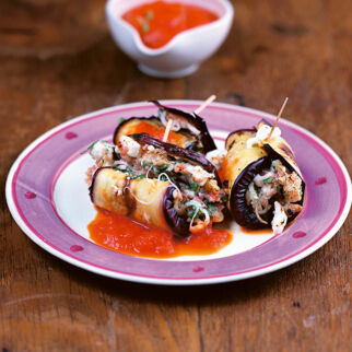 Die Aubergine waschen, putzen, längs in 6-8 Scheiben von 3-4 mm Dicke schneiden. Scheiben auf der Arbeitsfläche nebeneinander ausbreiten und dünn aber gleichmäßig mit Salz bestreuen. Auberginenscheiben ziehen lassen, damit sich die Bitterstoffe lösen.