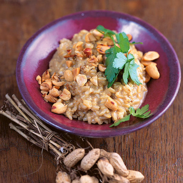 Die Erdnussbutter und die Erdnüsse unter den Reis rühren, diesen mit Salz und Pfeffer abschmecken, kurz ausdampfen lassen und mit Petersilie bestreut servieren.