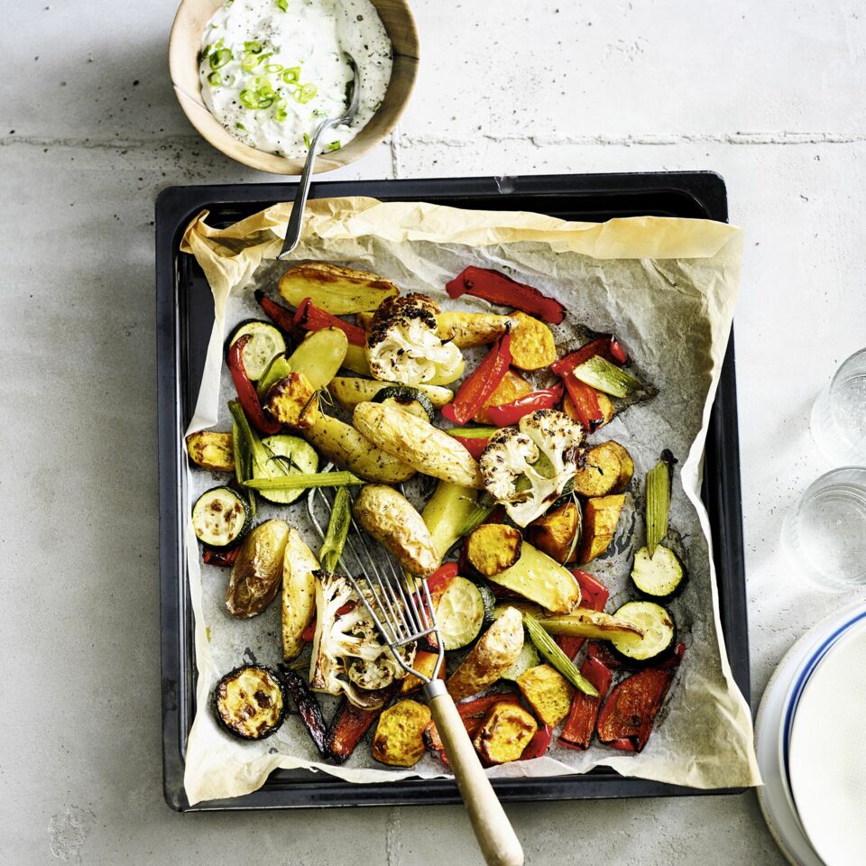 Aromatisches Gemüseblech mit Blumenkohl und Kartoffeln. Dazu passen auch Möhren und Rosenkohl - brauchen aber ein wenig länger.