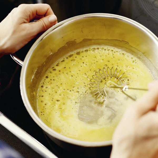 Den Kürbis mit ¼ l Milch in einen hohen Mixbecher geben und mit dem Pürierstab glatt mixen. Eine Auflaufform (ca. 18 × 30 cm) mit Butter einfetten, beide Käsesorten mischen. Die Ofentemperatur auf 220° erhöhen.