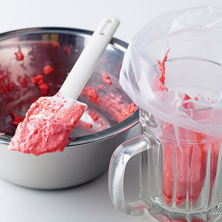 Die Baisermasse in einen Spritzbeutel mit glatter Tülle füllen. Auf das Blech 26 Kreise mit ca. 4 cm Ø spritzen. Die Macarons an einem warmen Ort 30 Min. ruhen lassen. Sie verlaufen im Idealfall ein wenig und werden oben glatt. An der Oberfläche sollen sie jetzt nicht mehr kleben.