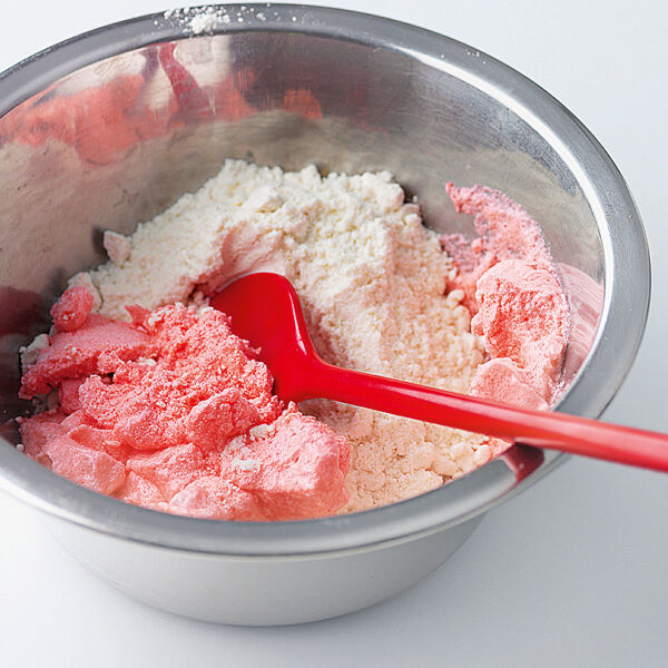 Backblech mit einer Silikonmatte oder Dauerbackfolie belegen. Für die Baisermasse die Mandeln schälen und im Blitzhacker fein mahlen. Mit dem Puderzucker noch mal mahlen, Backpulver untermischen. Das Eiweiß mit Salz schaumig schlagen. Den Zucker einrieseln lassen und das Eiweiß sehr steif schlagen. Tropfenweise Lebensmittelfarbe (etwa 15 Tropfen) dazugeben. Die Mandel-Puderzucker-Mischung mit einem Rührlöffel unterheben.