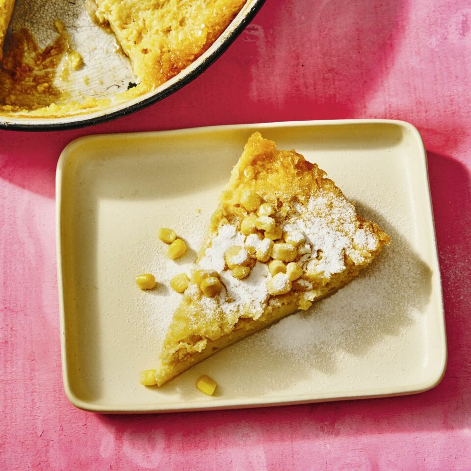Den Kuchen aus dem Ofen nehmen und abkühlen lassen. Mit den restlichen Maiskörnern garnieren und mit Puderzucker bestreuen.