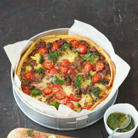 Springform mit Backpapier auslegen und ölen. Nudeln spiralförmig am Boden und Rand verteilen. Brokkoli, Tomaten und Hackmasse einschichten, mit Eiermilch übergießen. Torte mit Alufolie abdecken und im Ofen (Mitte, Umluft 160°) ca. 35 Min. backen. Alufolie entfernen, restlichen Käse darüberstreuen und in ca. 15 Min. fertig backen.
