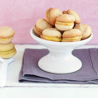 Für die Füllung in einem kleinen Topf Lemon Curd mit Gelierzucker, Limettensaft und -schale bei mittlerer Hitze zähflüssig einkochen lassen. Die Makronenringe damit füllen und auf Backpapier abkühlen lassen. Anschließend mit Puderzucker bestäuben. Die Tartelettes sind max. 1 Woche haltbar.