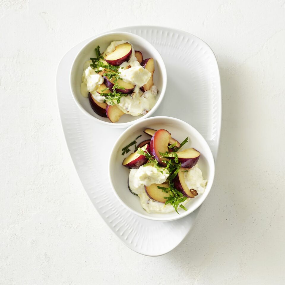 Den Mandelgrieß mit dem Pflaumensalat anrichten. Die Minze abbrausen, trocken tupfen. Die Blättchen abzupfen, fein schneiden und über das Dessert streuen.