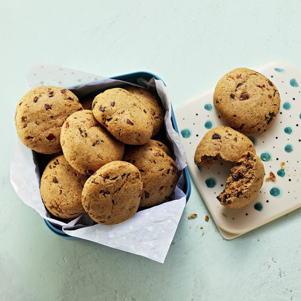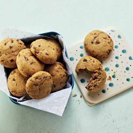 Den Teig in ca. 20 Portionen teilen und jede Teigportion mit den Händen (ggf. vorher etwas anfeuchten) zu einem kleinen Keks formen. Diese mit etwas Abstand nebeneinander auf das Blech legen. Im Ofen (Mitte) 15-18 Min. backen.