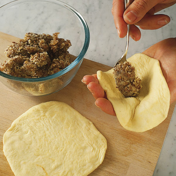 Den Teig in 20 Stücke teilen und zu Kugeln rollen. Zwischen den Handflächen zu Fladen von 10 cm Ø formen (Step 1), jeweils etwas Füllung darauf setzen (Step 2) und die Ränder gut festdrücken (Step 3). Aufs Backblech legen. Eigelb mit einigen Tropfen Wasser verquirlen, die Taschen damit einpinseln. Mit Sesam bestreuen. Die Mandeltaschen im heißen Backofen (Mitte) in ca. 20 Min. goldbraun backen. Auf einem Gitter abkühlen lassen.