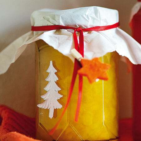 Die Mangokonfitüre in ein hitzebeständiges Gefäß mit Ausgießer geben und in die Gläser füllen. Dabei darauf achten, dass der Rand sauber bleibt. Die Gläser sofort verschließen und abkühlen lassen.