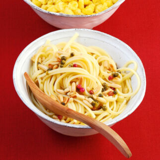In einem Topf 2 l Wasser aufkochen lassen, 2 TL Salz und die Nudeln hineingeben, einmal umrühren und die Nudeln nach Packungsangabe in ca. 10 Min. bissfest kochen.