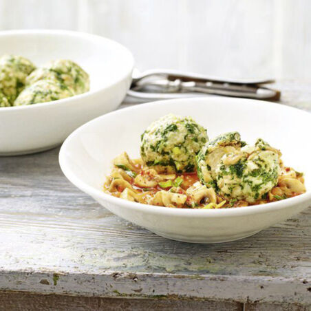 Währenddessen das Öl in einer weiten Pfanne erhitzen und die Pilze darin bei starker Hitze unter Rühren ca. 3 Min. braten. Zwiebeln und Knoblauch kurz mitbraten. Dann die Tomaten einrühren und das Gemüse offen bei schwacher Hitze ca. 5 Min. köcheln lassen. Mit Salz und Chiliflocken abschmecken und das Basilikum einrühren. Die Knödel mit einem Schaumlöffel aus dem Wasser heben und mit dem Pilzragout servieren.
