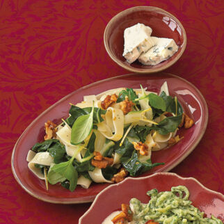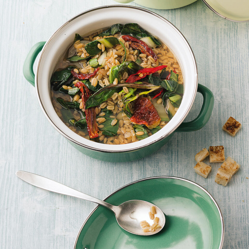 Grünkern in ein Sieb abgießen. Im Topf 30 g Butter zerlassen und Mangoldstiele darin bei mittlerer Hitze ca. 5 Min. dünsten. Fond, Mangoldblätter und Grünkern dazugeben, aufkochen und ca. 4 Min. offen köcheln. Peperoni, Tomaten, Crème fraîche und Zucker unterrühren, mit Salz, Pfeffer und Zitronensaft abschmecken.