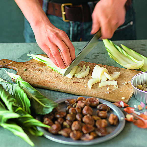 Schalotten und Knoblauch schälen und fein würfeln. Mangoldstiele und -blätter trennen, beides waschen und trocken schleudern. Stiele und Blätter in Streifen schneiden (Bild 1). Die Maronen vierteln. Den Rosmarin waschen und trocken schütteln.