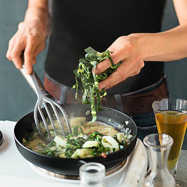 In einer Pfanne 2 EL Butter zerlassen, Mangoldstiele, Schalotten, Knoblauch und Speck darin bei mittlerer Hitze ca. 5 Min. andünsten. Nach Belieben mit Wein ablöschen und etwas einkochen lassen. Mangoldblätter und Brühe dazugeben (Bild 2), alles aufkochen und köcheln lassen, bis die Blätter zusammengefallen sind.