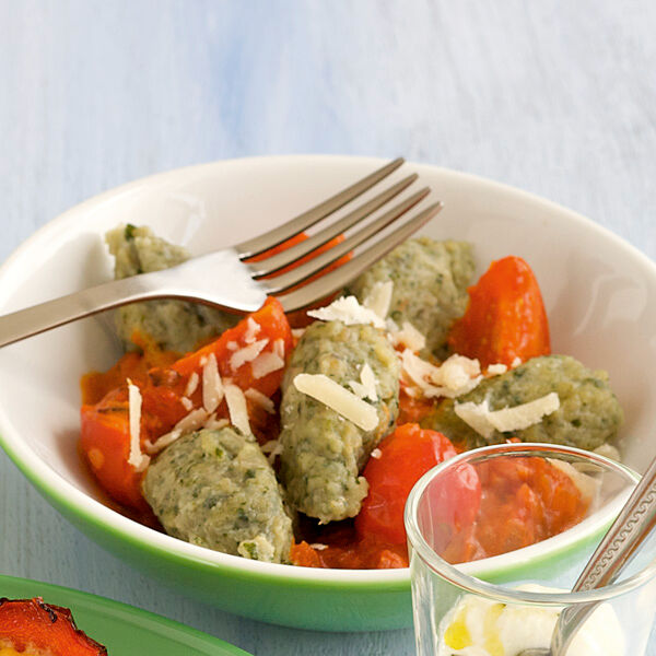 Die würzigen Nocken aus Mangold und Speckstückchen sind ein echter Hochgenuss. Die Sauce aus Kirschtomaten passt super dazu.