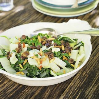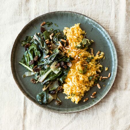 Sultaninen und Zimt machen das Mangoldgemüse besonders aromatisch, Pinienkerne sorgen für einen extra Biss. Servieren sie es am besten zu duftendem Basmatireis.