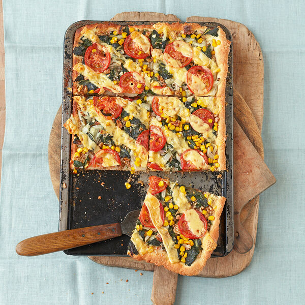Den Quark-Öl-Teig auf dem Backblech ausrollen und mit Butter-Walnuss-Brösel bestreichen. Die Mangoldmischung darauf verteilen, mit Tomatenscheiben belegen. Mit wenig Salz und Pfeffer würzen und mit übrigem Öl beträufeln. Die Käsestreifen diagonal darauflegen. Den Kuchen im Backofen (Mitte, Umluft 180°) 35-40 Min. backen.