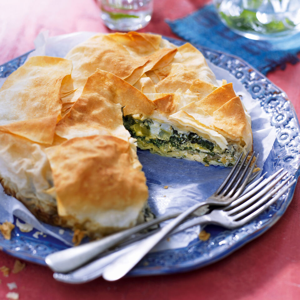 Den Backofen auf 180° vorheizen. Butter schmelzen, die Springform mit etwas Butter auspinseln. Die Teigblätter aus der Packung nehmen, auf einem Geschirrtuch auslegen und mit gut zwei Dritteln der restlichen Butter bepinseln. Die Blätter so in der Form nebeneinander überlappend anordnen, dass sie den Boden vollständig bedecken und auch noch gut über die Hälfte der Form hinaushängen.