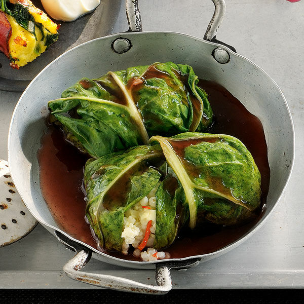 Die Chilischoten hacken. Den Käse durch ein grobes Sieb drücken. Beides unter die Graupen ziehen. Die Mangoldblätter zu 12 Quadraten aufeinanderlegen, die Füllung daraufgeben, die Seiten einschlagen und die Blätter eng einrollen.
