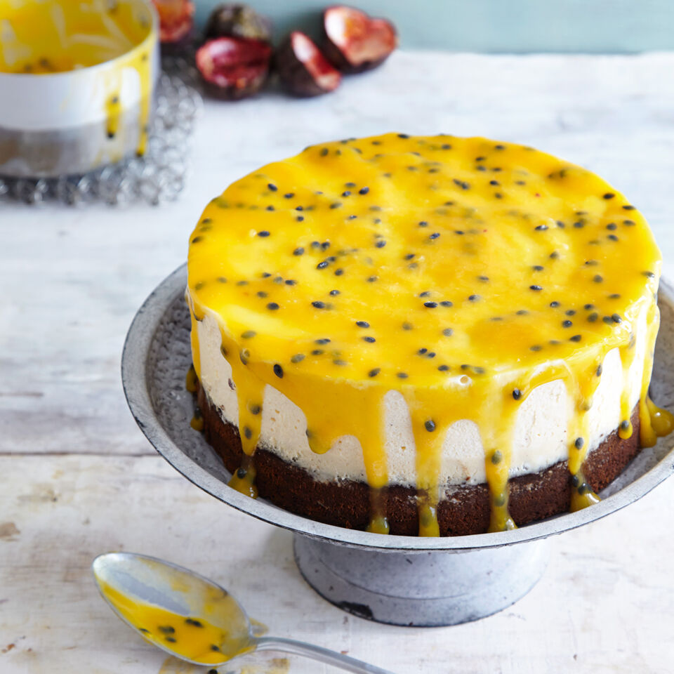 Am nächsten Tag für die Glasur die Maracujas halbieren, jeweils das Mark und die Kerne herauslösen und in einem Topf mit Honig, übrigem Zucker und Nektar aufkochen. Die Stärke mit 20 ml Wasser glatt rühren und dazugeben. Alles ca. 2 Min. köcheln und dann abkühlen lassen. Die Eistorte mit der Masse locker überziehen.