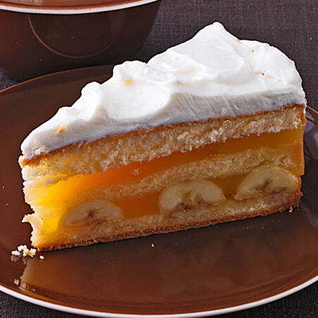 Schichten von luftigem Biskuitboden wechseln sich ab mit einer fruchtig-exotischen Creme, die den Gaumen mit Sommernoten kitzelt.