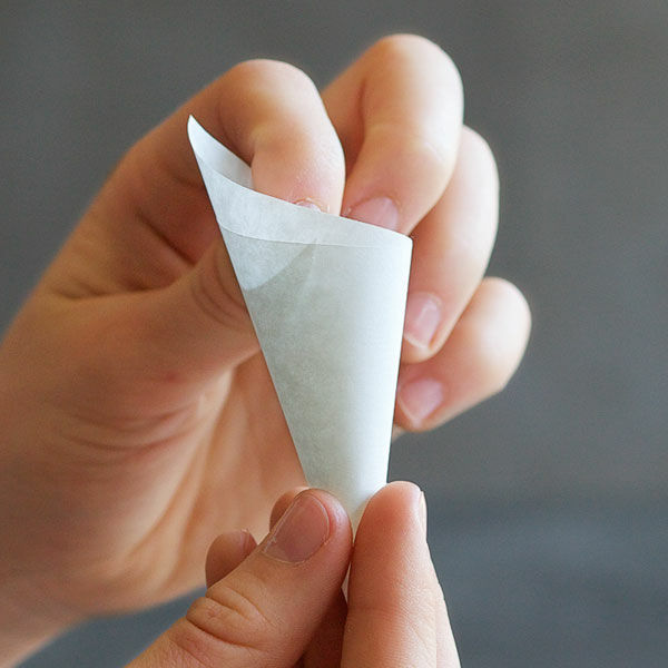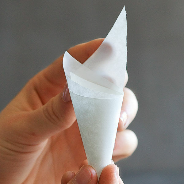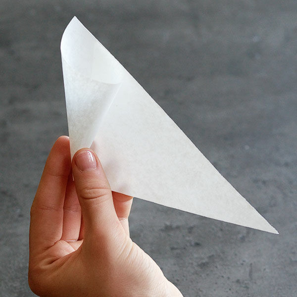Die Zartbitterkuvertüre hacken, schmelzen und temperieren. Für einen Papierspritzbeutel das Papier zurechtschneiden und zusammenlegen. Dann zu einem kleinen Papierspritzbeutel falten und den Rand umknicken.