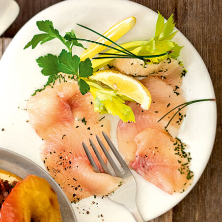 Zum Servieren die Filets herausnehmen, die Gewürze abwischen und die Forellenfilets gut trocken tupfen. In dünne Scheiben aufschneiden und anrichten. Mit Latschenspitzen garnieren.