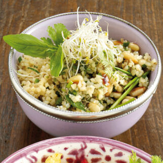 Inzwischen Schnittlauch und Rucola waschen und trocken schütteln. Den Schnittlauch in feine Röllchen schneiden. Von der Rucola die Stiele wegschneiden, die Blätter grob hacken. Die Radieschen mit den Kräutern vermengen und mit Salz und Pfeffer nochmals abschmecken.