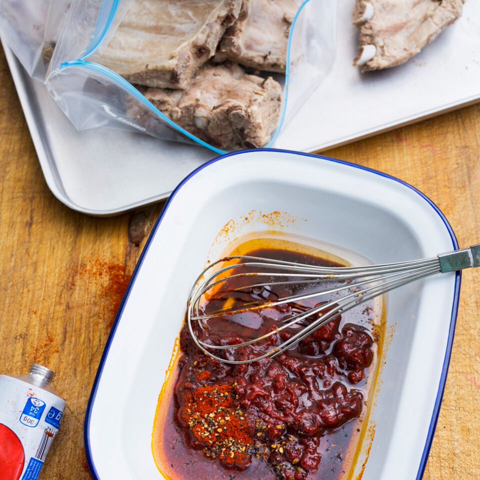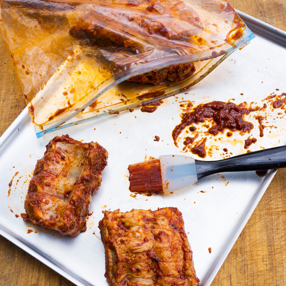 Die abgekühlten Spareribs mit der Marinade in einen Gefrierbeutel geben. Beutel verschließen und durchkneten, damit sich Fleisch und Marinade verbinden. Fleisch im Kühlschrank mind. 24 Std., am besten über Nacht, ziehen lassen.