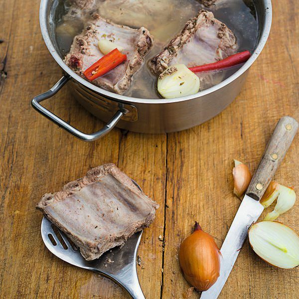 Reichlich Wasser in einem großen Topf aufkochen. Zwiebel und Knoblauch schälen. Zwiebel und 1 Knoblauchzehe halbieren, mit 1 Chilischote, 1 TL Thymian, knapp 1 EL Salz und den Rippchen ins sprudelnde Wasser geben. Die Rippchen im Sud bei mittlerer Hitze in 30 - 40 Min. weich kochen, dann abgießen, trocken tupfen und etwas abkühlen lassen.