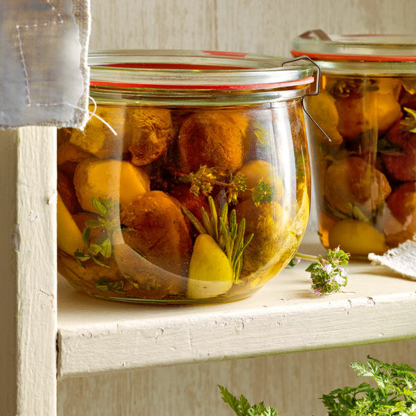 Die eingelegten Steinpilze eignen sich auch als kulinarisches Mitbringsel. Sie schmecken als Antipasti, verfeinern Salate und passen zu Ciabatta- oder Knoblauchbrot.