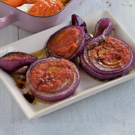 Ein Backblech mit Alufolie auslegen. Die Hälfte der Marinade aufstreichen und die Zwiebelscheiben darauf verteilen. Restliche Marinade auf die Zwiebeln streichen. Ziehen lassen, bis der Ofen vorgeheizt ist.