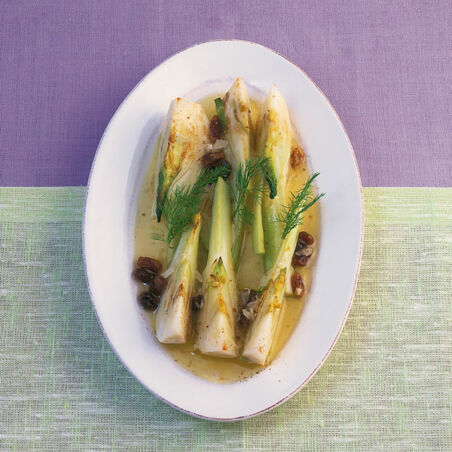 Fenchel in einer Pfanne in 2 EL heißem Olivenöl 5 Min. anschwitzen. Mit Wein und Brühe ablöschen. Fenchel zugedeckt in 6-8 Min. bissfest kochen (Probe durch Anstechen mit der Gabel). Marinade und Rosinen zugeben, Fenchel zugedeckt 2 Std. ziehen lassen, mit Fenchelgrün garniert servieren.