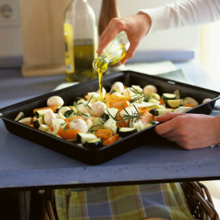 2 EL Öl mit Kreuzkümmel, Salz und Pfeffer würzen. Fenchel, Aprikosen und Würzöl mischen, in einer großen Auflaufform verteilen. Im Ofen (Mitte, Umluft 180°) ca. 40 Min. garen, der Fenchel soll noch etwas Biss haben.