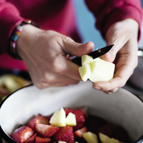 Die Erdbeeren waschen und erst dann vom grünen Ansatz befreien. In umgekehrter Reihenfolge würden die Früchte Wasser ziehen. Die Erdbeeren halbieren oder vierteln und in einen großen Topf geben. Die Äpfel schälen, vierteln, entkernen und als dünne Schnitze direkt zu den Erdbeeren in den Topf schnippeln. Den Limettensaft dazugeben.
