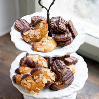 Den Backofen auf 180° (Umluft 160°) vorheizen. Das Backblech mit Backpapier auslegen. Die Teigrollen in 40 ca. 0,5 cm dicke Scheiben schneiden, diese auf das Blech legen. Im Backofen (Mitte) 10-12 Min. backen. Die Plätzchen herausnehmen, mit dem Backpapier vom Blech ziehen und abkühlen lassen.