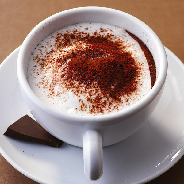 Ein Stück dunkle Schokolade zum Cappuccino schmeckt wunderbar. Ein Stück dunkle Schokolade im Cappucino ist göttlich.