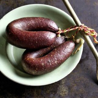 Das Füllrohr (26 mm) am Fleischwolf oder Wurstfüller befestigen und den Darm aufziehen. Die Fleischmasse in den Darm füllen, dabei Würste von 10-12 cm Länge abdrehen. Die Würste auseinanderschneiden und mind. 3 Std. im Kühlschrank ruhen lassen.