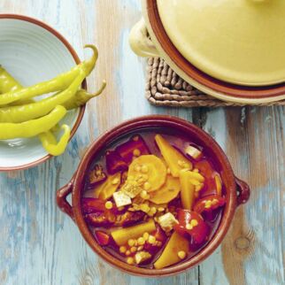 Im gut sortierten Supermarkt sind mittlerweile unterschiedliche marokkanisch oder arabisch angehauchte Gewürzmischungen erhältlich, wie etwa das Tajine-Gewürz. Der Eintopf schmeckt aber auch mit Baharat oder Ras el Hanout ganz hervorragend.