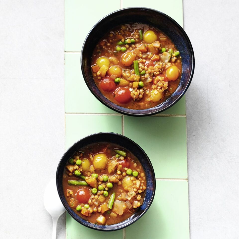 Aprikosen klein würfeln und mit den Linsen und dem Tajine-Gewürz unter das Gemüse mischen. Das heiße Wasser angießen und alles zugedeckt 8-10 Min. bei kleiner Hitze köcheln lassen, dabei nach der Hälfte der Zeit salzen.