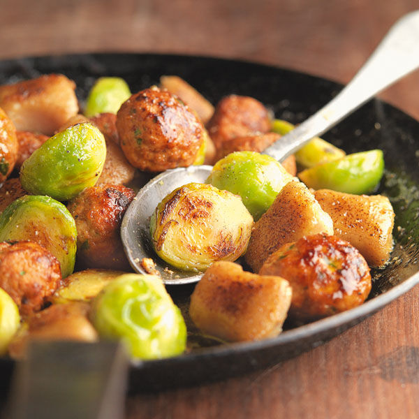 Butterschmalz in einer großen beschichteten Pfanne erhitzen und die Gnocchi zusammen mit den Hackbällchen und den Kohlsprossen bei mittlerer Hitze ca. 12-14 Minuten anbraten. Dabei gelegentlich vorsichtig mit einem Pfannenwender durchmischen. Butter unterschwenken, alles noch mal kräftig mit Salz und Pfeffer würzen und servieren.