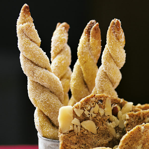 Maronenzöpfe dünn mit dem Eigelb bepinseln und in dem übrigen Zucker wälzen. Auf das Blech legen und im Ofen (Mitte) 20-25 Min. backen.